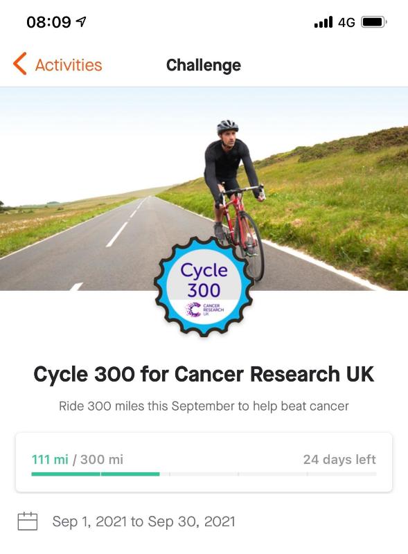 Thank you for visiting my Cancer Research UK Cycle 300 page. This September, before the end of the month, I will complete 300 miles on my bike for Cancer Research UK. I will be pedalling harder than ever because I want to raise money for life-saving research and help bring forward the day when all cancers are cured. Every penny makes a huge difference to vital cancer research so please show your support with a donation to my page. I just thought it was about time I did my bit to help