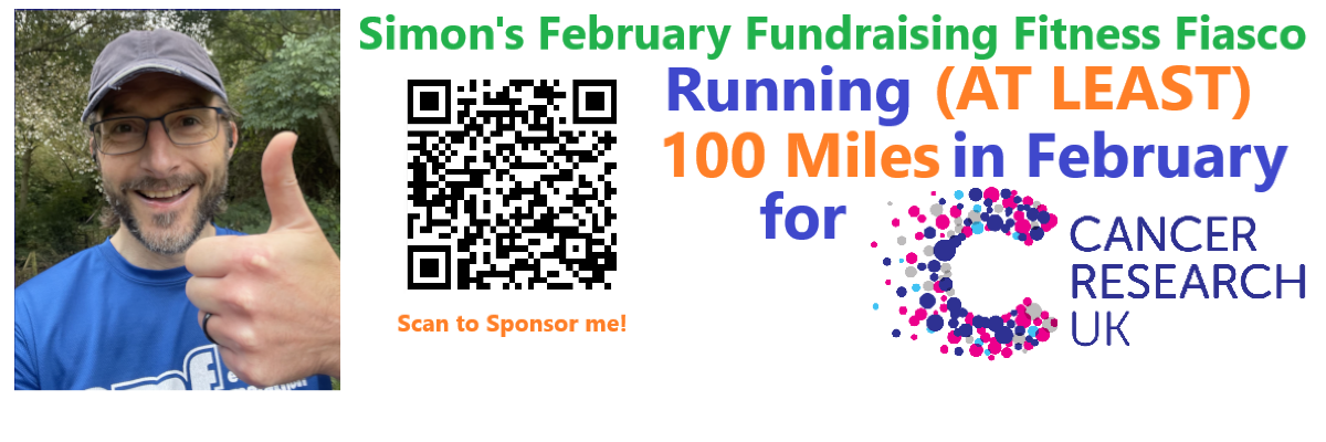 Thanks for popping by my fundraising page. I’m going to be attempting to Run AT LEAST 100 Miles this February to help raise money for Cancer Research UK. That means at least 4 miles a day. While I've done "run everyday for a month" challenges before that's only been 3 miles a day and I'm starting from a low fitness point having run only 6 miles in the last 6 weeks. This year I'm also planning to track my "running carbon footprint" so will endeavour to include some calculations and interesting data points along the way. You can sponsor me per mile, per day, per 100 miles or per song you'd like to get on my running playlist... any contribution to the cause will be very gratefully received. Cheers Simon