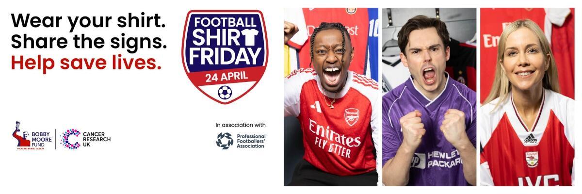 I've joined the Football Shirt Friday squad to help tackle bowel cancer. On Friday 24 April 2026, the Bobby Moore Fund is calling on people across the nation to 1 – Wear your shirt: Put on your favourite football shirt for work, school, at home or just out and about. 2 - Share the signs: Like and share our posts to raise awareness of the signs and symptoms of bowel cancer. 3 - Help save lives: Donate to help fund vital bowel cancer research. 100% of the money raised will go towards funding pioneering bowel cancer research.